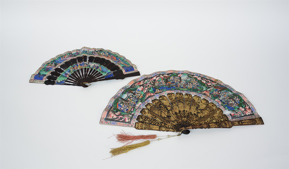 Lotto di due ventagli con pagine in carta con decoro"cento facce", la guida laccata e dorata (difetti, rotture, mancanze)