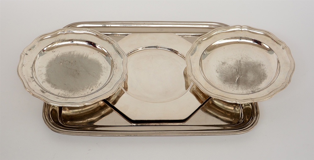 Lotto composto da due piatti con bordo mosso, uno ottagonale e un vassoio in metallo argentato, misure diverse (lievi difetti)