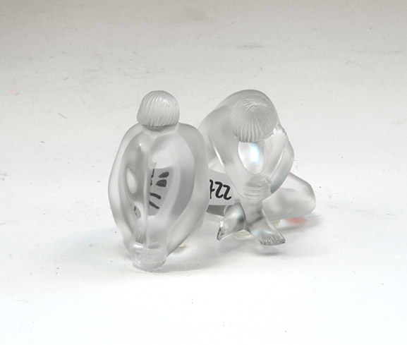 Lotto di due statuine raffiguranti donne accovacciata in vetro soffiato in stampo. Francia, seconda metà secolo XX