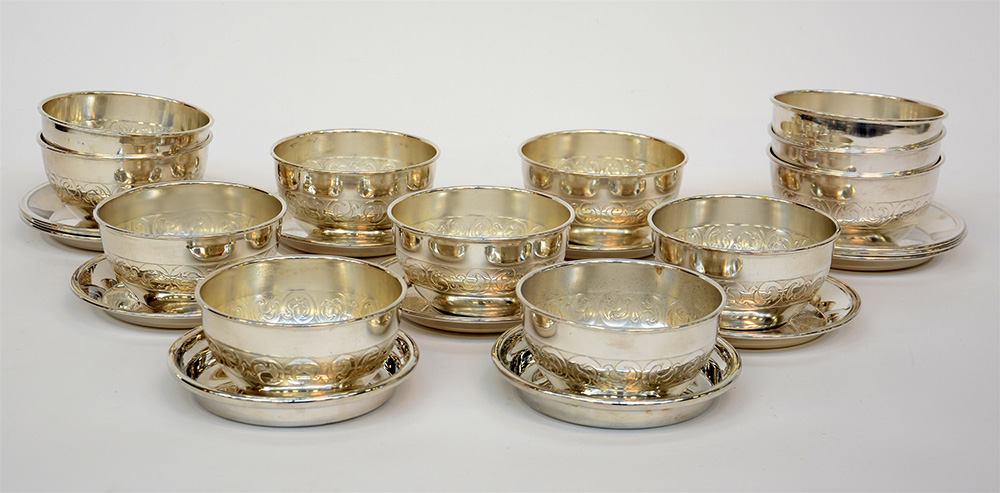 Lotto composto da dodici ciotole lavadita con piattini in metallo argentato con decoro in rilievo (lievi difetti)