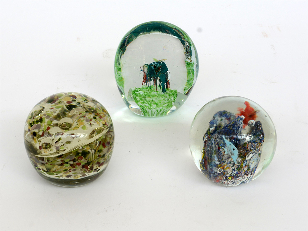 Manifattura di Murano.Gruppo di tre presse-papier in vetro, di cui due tondi...
