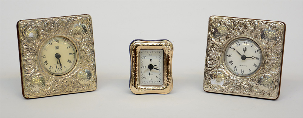 Lotto composto da tre sveglie da tavolo con cornice sbalzata in lamina d'argento e metallo (lievi difetti)