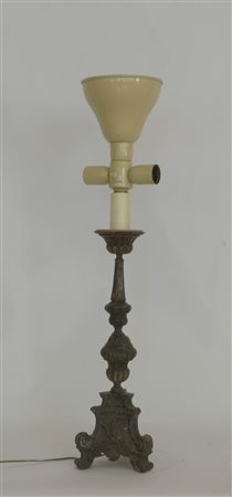 Candeliere tripode in metallo sbalzato e argentato montato a luce elettrica...