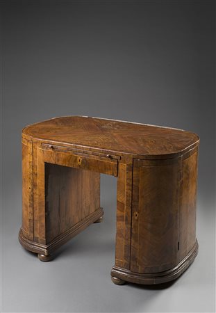 Scrivania da centro lastronata in noce e filettata, pianetto estraibile...