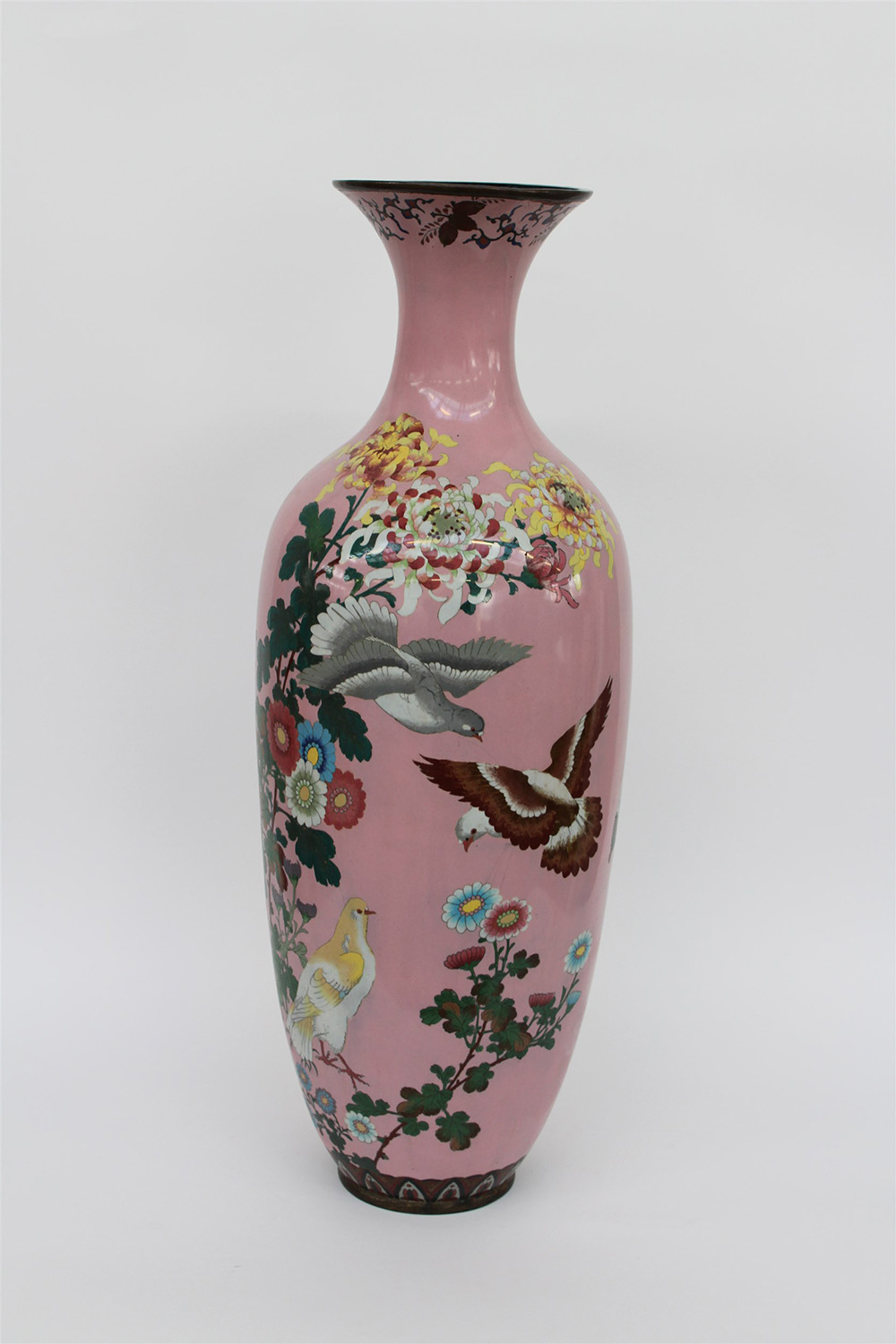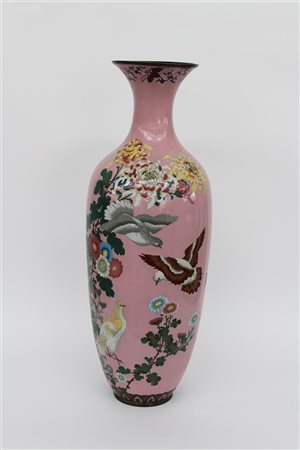 Grande vaso cloisonné decorato con colombe tra rami in fiore su fondo rosa...
