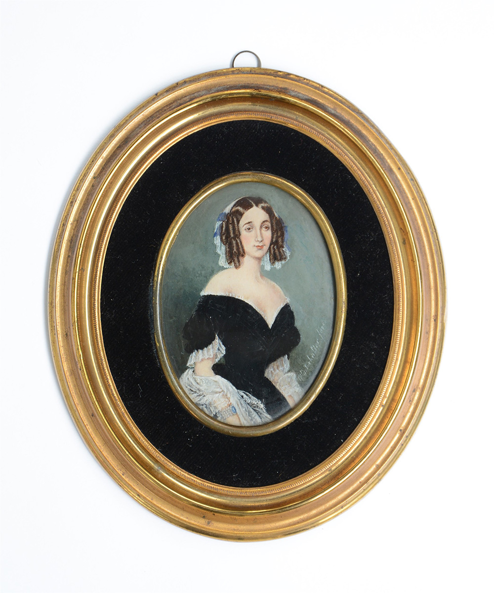 Maestro del secolo XIX, “Ritratto di nobildonna”, miniatura ovale su vetro (cm 9x6,5) firmata in basso a destra, cornice in metallo dorato (lievi difetti)