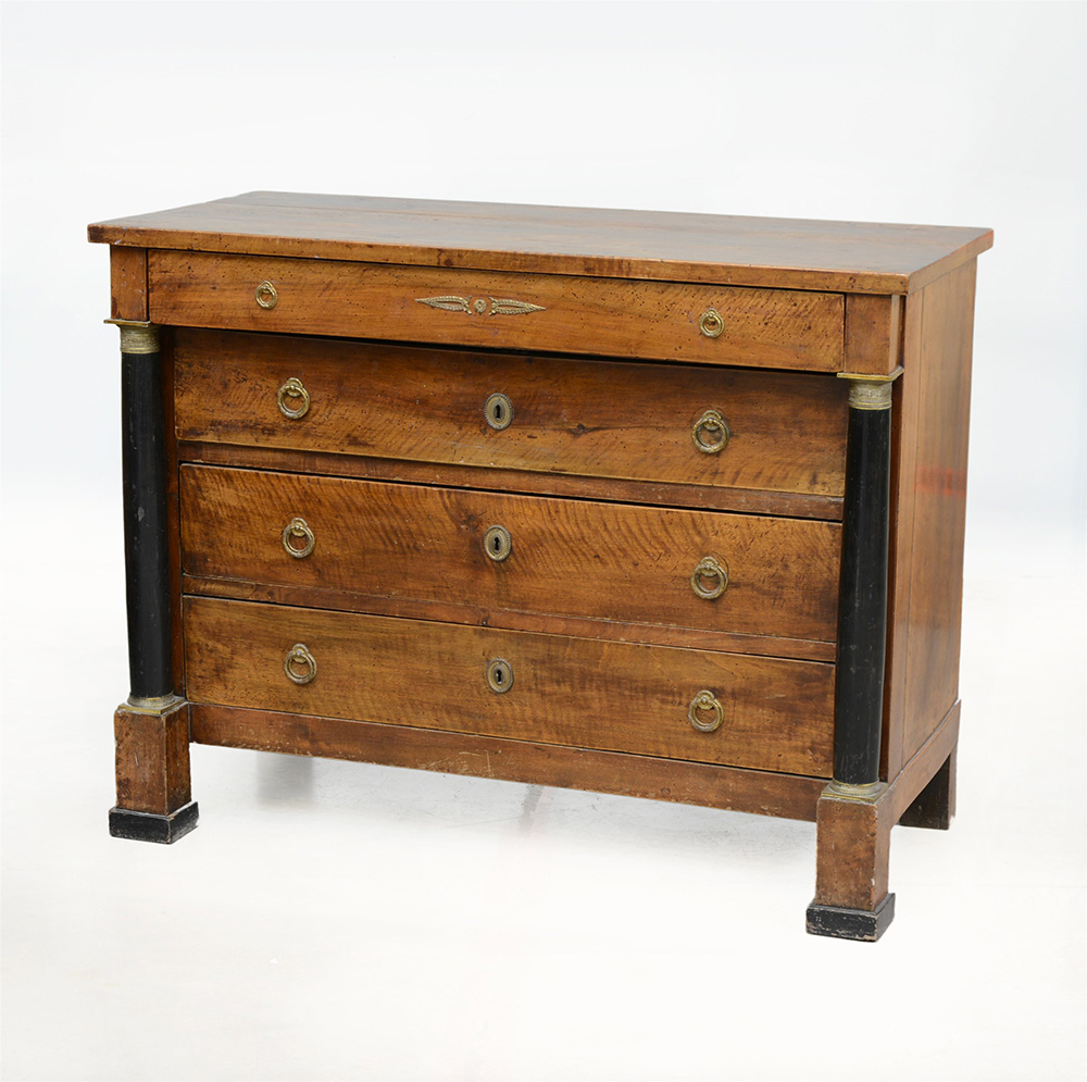 Comò "Impero" a tre cassetti e mezzo, montanti a colonna tornita a tutto tondo ed ebanizzata decorata da capitello e base in metallo dorato e cesellato, piedi anteriori a pilastro, prima metà del secolo XIX (cm 108x90x53) (difetti)