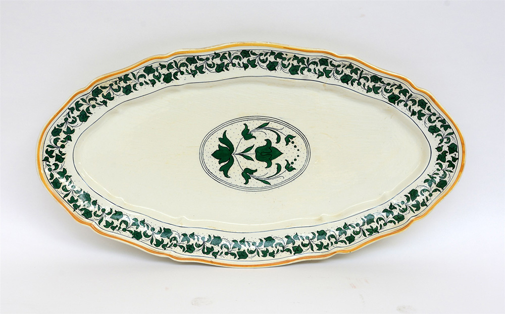 Grande vassoio ovale mistilineo in terraglia con decorazione in verde con festone vegetale sulla tesa e medaglione centrale con fiori stilizzati (lunghezza cm 63). Marca di fabbrica CR e numeri incussi. Manifattura lombarda, inizi XX secolo (difetti)