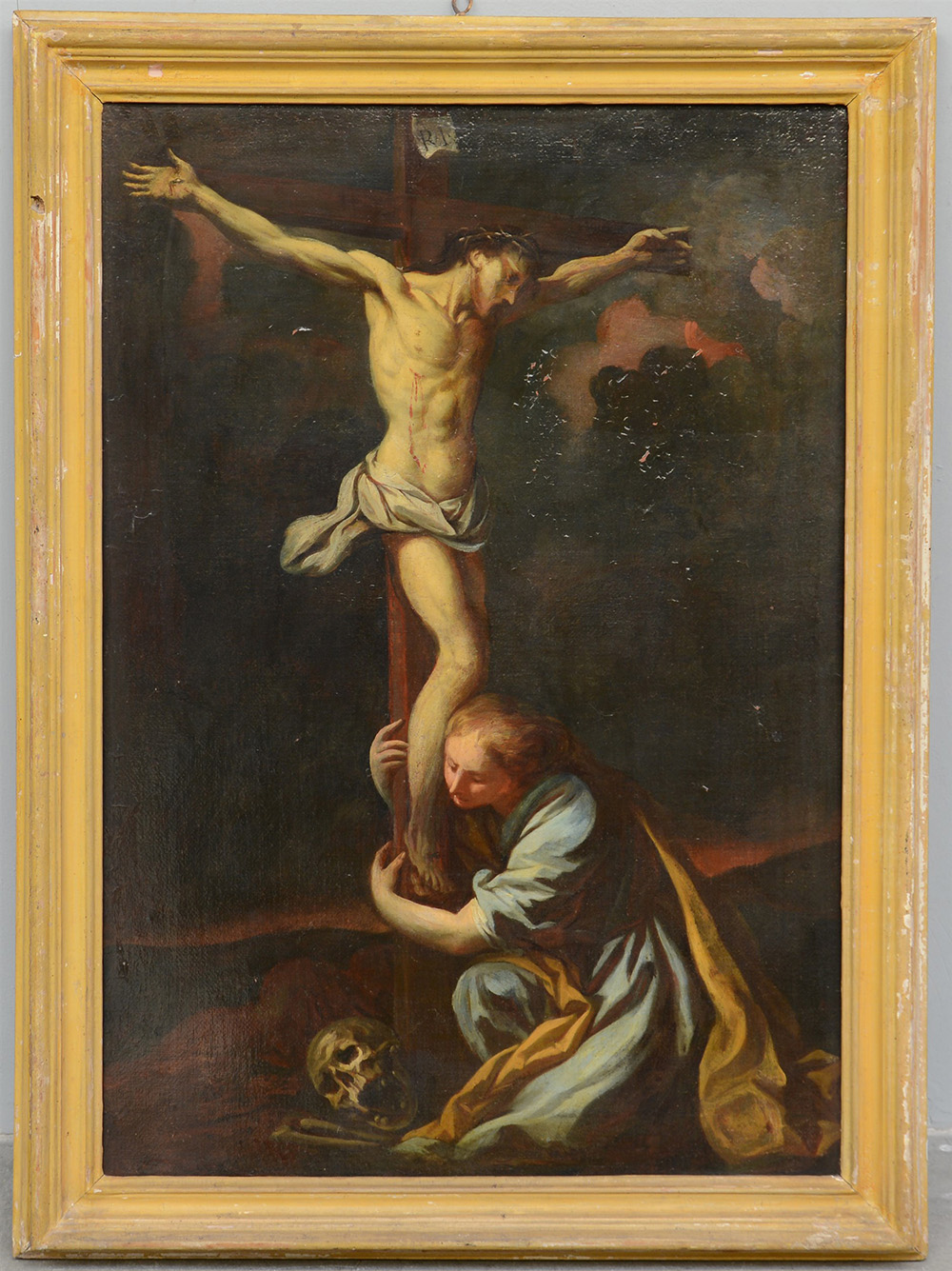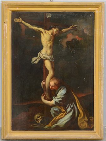 Scuola della fine del sello XVIII "Cristo crocifisso" olio su tela (cm 84x59) in cornice laccata (difetti e restauri)