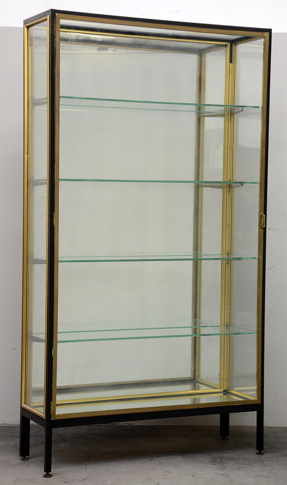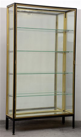 Vetrina a cinque ripiani con struttura in metallo verniciato nero e profili in ottone, fondo a specchio. Anni '60 del secolo XX (cm 110x200x38) (lievi difetti)