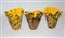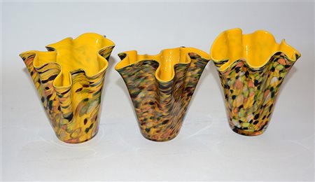 Lotto composto da tre vasi a fazzoletto in vetro policromo, interno in vetro giallo (h max cm 20,5)