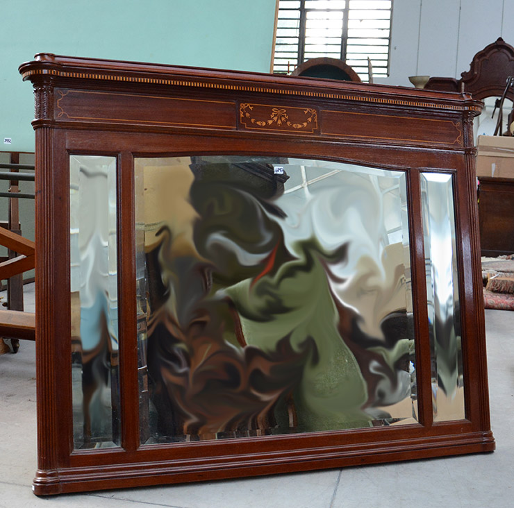 Caminiera in legno con specchio tripartito, cimasa filettata in legno chiaro e intarsiata con ghirlanda e nastro. Montanti scanalati (cm 135x105) (difetti)