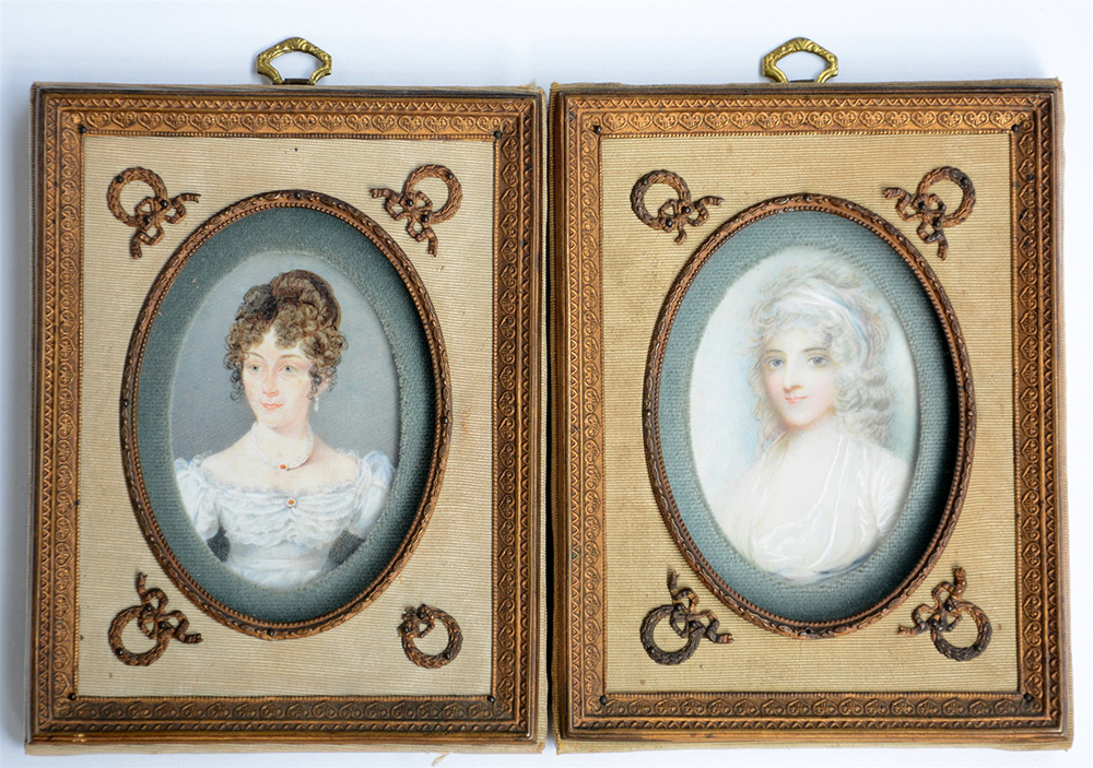 Coppia di miniature ovali raffiguranti gentildonne (cm 7x5) entro cornici in velluto e metallo dorato e cesellato a nastri e palmette. Fine secolo XIX (difetti)