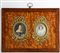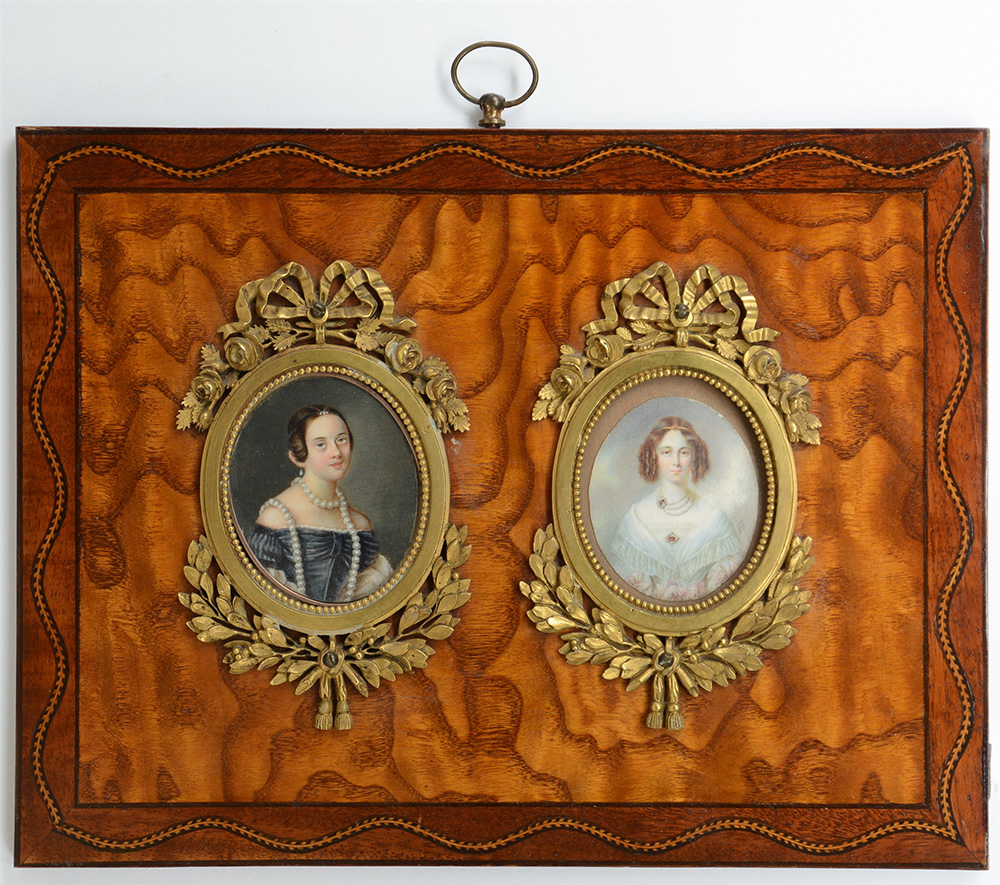 Lotto di due miniature ovali raffiguranti gentildonne con collana di perle e diademi (cm 6,5x5,5 e cm 6x5) in cornicette di bronzo dorato e cesellato a nastri, fiori e foglie. Fine secolo XIX, montate su pannello radicato di epoca posteriore (difetti)