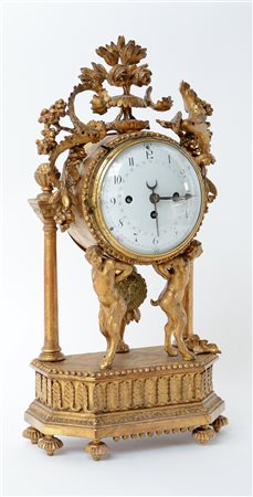 Pendola da tavolo in legno dorto e intagliato a fiori, foglie e volute, quadrante smaltato a numeri arabi e calndario sorretto da due figure di fauni a tutto tondo poggianti su base sagomata, moviemnto con carica giornaliera, suoneria delle ore e dei quarti su campanello. Sec. XIX (difetti)
