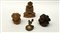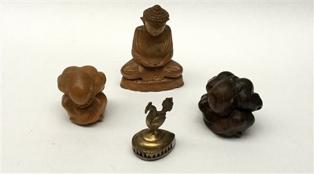 Lotto di tre sculture indonesiane in legno intagliato e un campanello tibetano in bronzo sormontato da un gallo (lievi difetti)