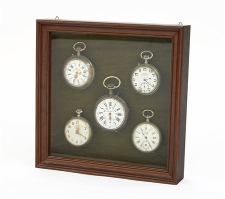 Lotto composto da cinque orologi da tasca di diversa marca, misure. In teca (difetti)