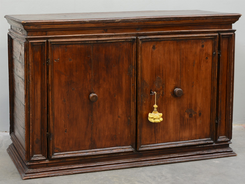 Credenza a due ante in legno dolce, decorata con sagomette in rilievo. Sec. XVII (cm 170x112x66) (difetti)