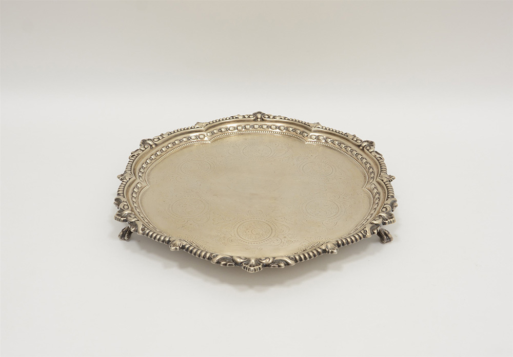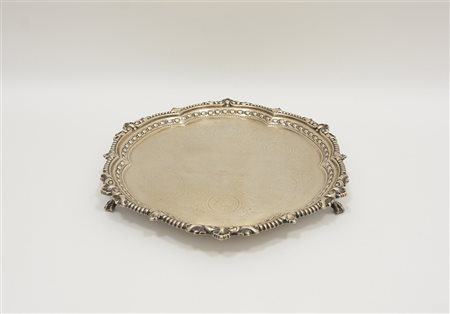 Salver in argento di forma circolare polilobata con fondo inciso con fiori e frutta entro riserve e bordo decorato da motivi floreali e godronature. Londra, 1898 (d. cm 34) (g 900 ca.)(difetti)