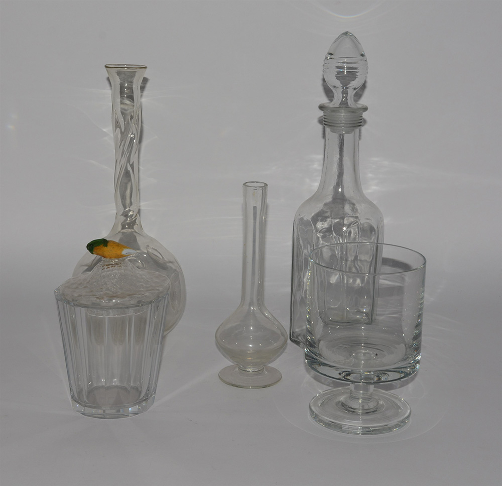 Lotto composto da due bottiglie e tre vasetti in cristallo (h max cm 35) (lievi difetti)