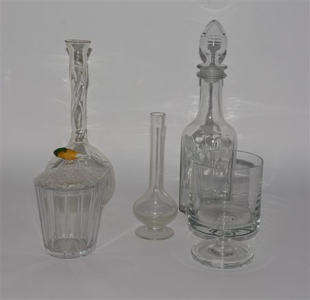 Lotto composto da due bottiglie e tre vasetti in cristallo (h max cm 35)...