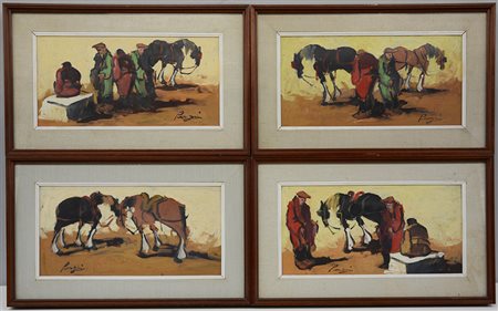 Firma indecifrata, gruppo di quattro dipinti raffiguranti uomini e cavalli, olii su masonite (cm 20x40) firmati in basso, in cornici