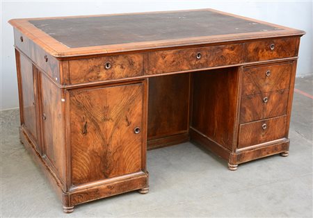 Scrivania doppia da centro lastronata in noce e radica di noce con sei cassetti nella fascia e quattro sportelli. Secolo XIX (cm 154x82x103)