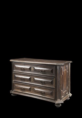 Cassettone in noce a tre cassetti pannellati, fianchi decorati con sagome in rilievo. Piedi torniti "a cipolla". Sec. XVII (cm 136x88x62) (difetti)