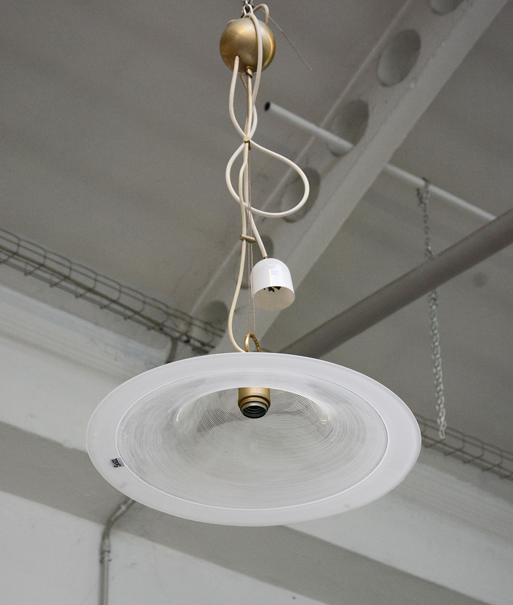 La Murrina, lampada a sospensione in vetro soffiato a mezza filigrana e fascia esterna incolore e lattimo, struttura in metallo ottonato. Murano, anni '80 (d cm 52) (lievi difetti)