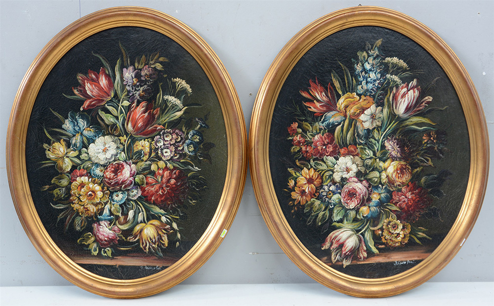 Firma indecifrata "Vasi fioriti" coppia di dipinti ovali ad olio su tela (cm...
