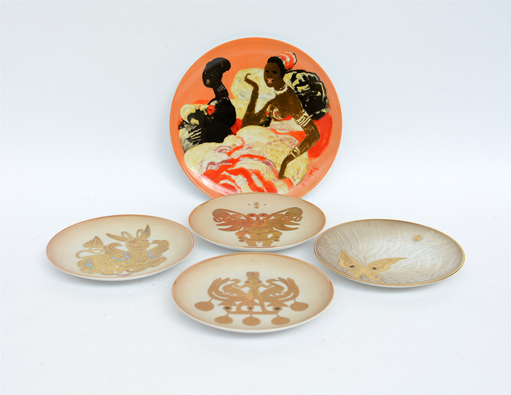 Lotto composto da un piatto decorativo firmato Salvatore Fiume e quattro piatti in porcellana con decoro a gioiello di Morbelli Arte (d max cm 26) (lievi difetti)