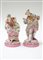 Coppia di sculture raffiguranti una dama e un gentiluomo in porcellana decorata in policromia nei toni del rosa (h max cm 25) (difetti)