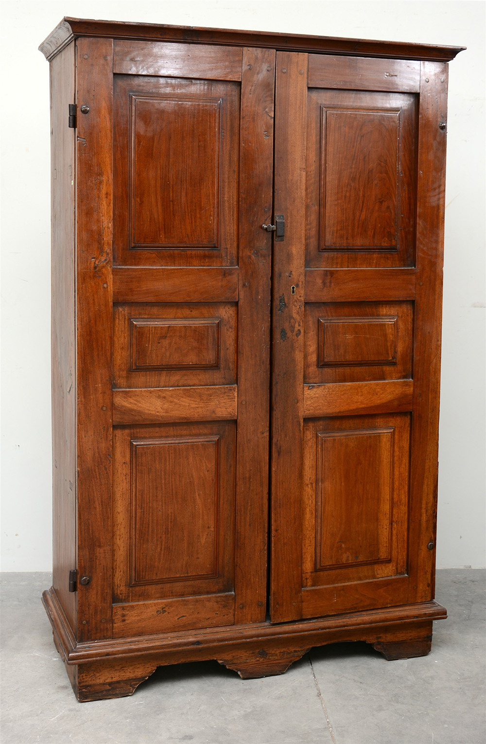 Antico armadio lombardo in noce a due battenti tripartiti con cardini a vista, interno con ripiani e sei cassettini. Piedi a mensola (cm 111x175x49) (difetti)