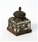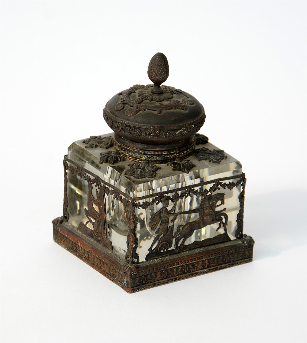 Calamaio stile impero in cristallo con guarnizioni e coperchio in metallo decorato a festoni e figure (h cm 12) (difetti)