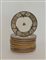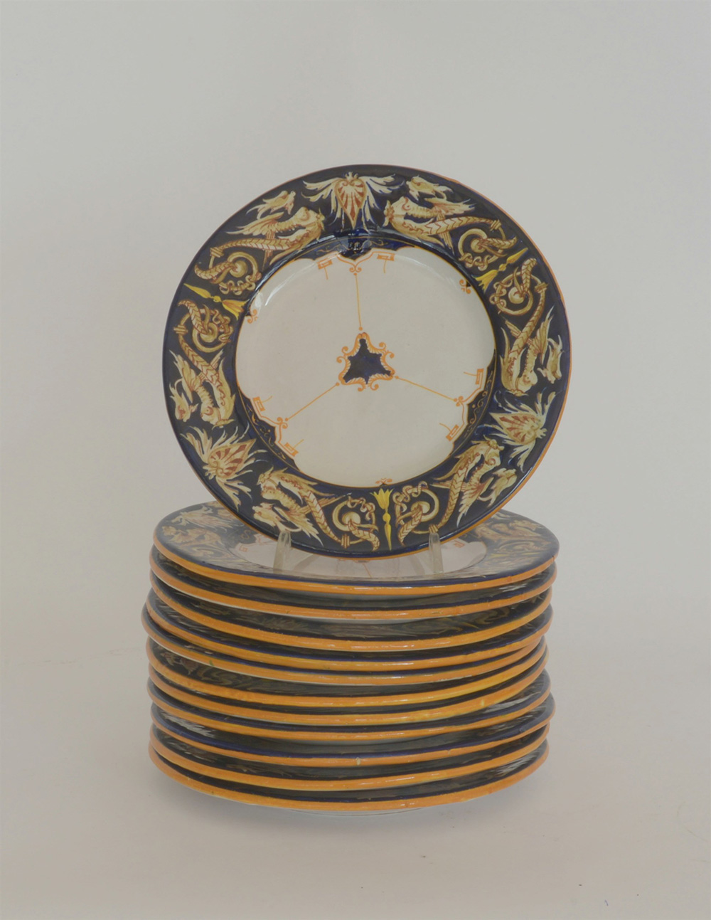 Gruppo di dodici piattini da frutta in maiolica decorati a raffaellesche su fondo blu. Faenza, anni '20. (d cm 21)