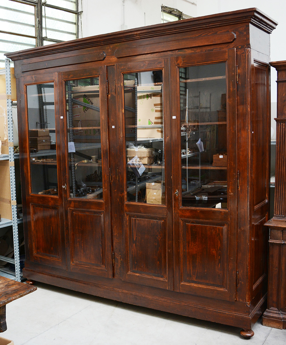 Mobile vetrina a quattro ante a vetri riquadrate nella parte inferiore, cappello aggettante, piedi anteriori torniti (cm 263x257x66)(difetti)