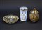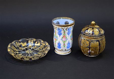 Manifattura di Boemia, lotto composto da un vasetto e un porta caramelle con coperchio e piattino (h max cm 13,5) (difetti)