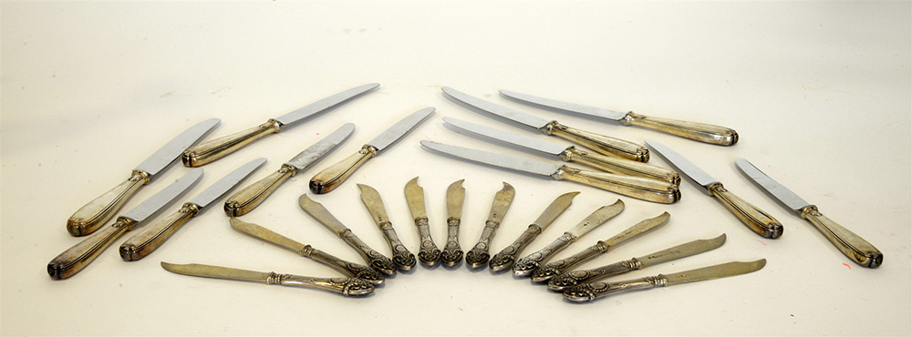 Lotto composto da coltelli di varie misure con manico in argento e alcune con lama in argento (gr tot 300 ca) (difetti)