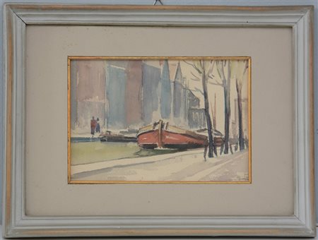 Firma indecifrata, "Scorcio di città con barcone" acquarello (cm 17x24)...