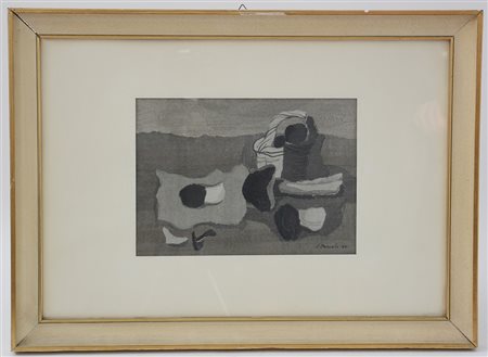 “Natura morta”, 1965, tecnica mista (cm 19x27), firmato e datato in basso a destra, in cornice, (difetti)