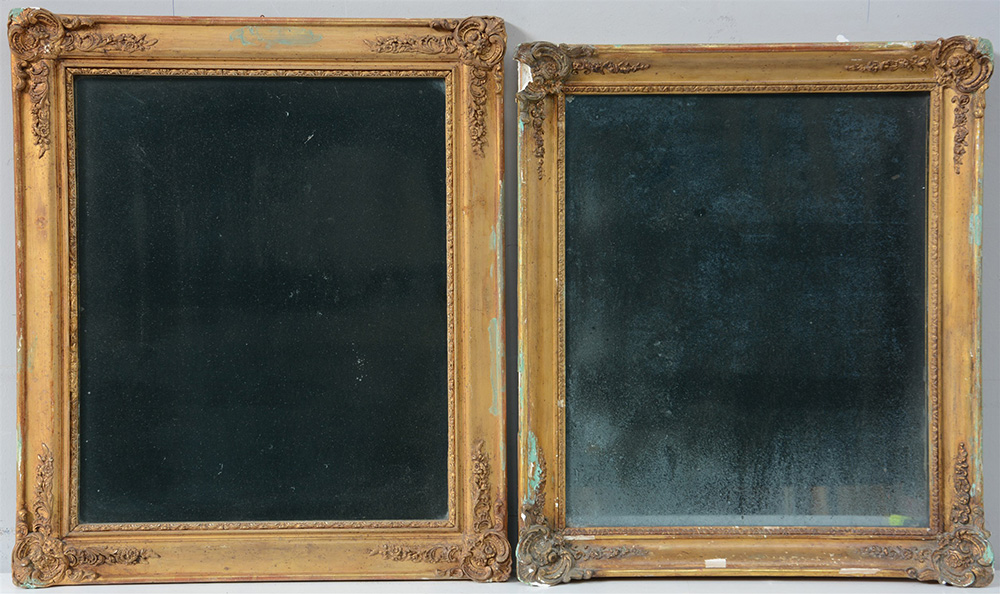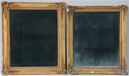 Lotto di due specchiere rettangolari di simil decoro in legno e pastiglia dorata, misure diverse (difetti e mancanze)