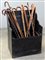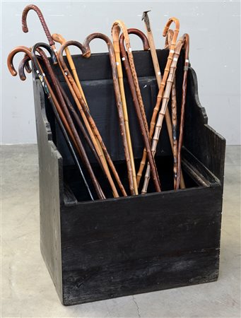 Lotto composto da una panchetta rustica con schienale, quindici bastoni da passeggio, una piccozza ed un ombrellino orientale (difetti)