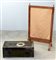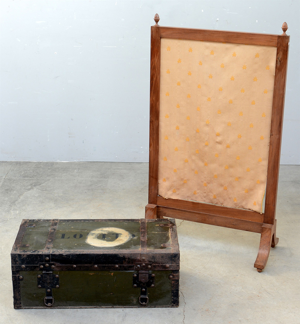 Lotto composto da un vecchio bauletto in legno e metallo ed un parascintille con pinnacoli torniti (difetti)