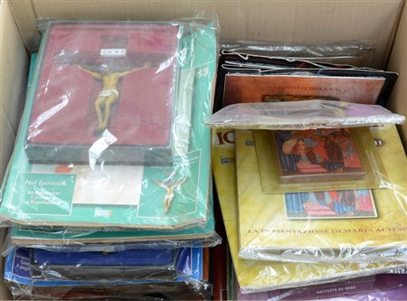 Cartone contenente numerosi crocifissi e piccole icone da collezione, in custodie e accompagnate da fascicoli, edite da Hobby & Work