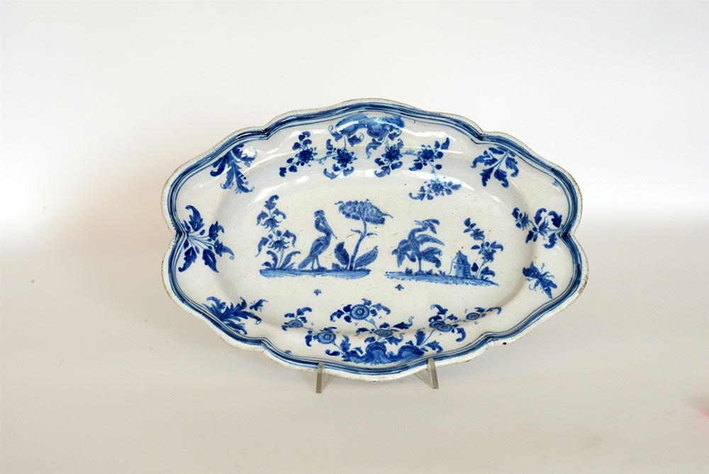 Manifattura di Moustier, Francia, sec XVIII Piatto ovale mistilineo in maiolica in monocromia blu "all'orientale" con due struzzi su due zolle erbose, rocce e fiori. Marchio di fabbrica (cm 39x27)