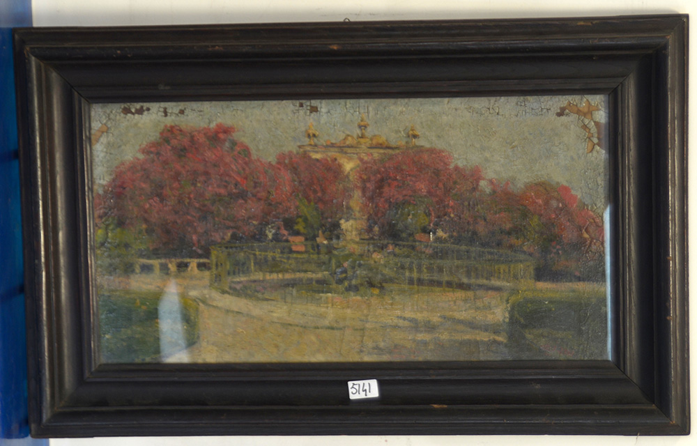 Scuola del XIX Secolo "Fontana a Villa della Quiete" olio su cartone (cm 22x50) Reca firma Ciani in basso a destra. Al retro: iscritto e locato. In cornice (gravi difetti)