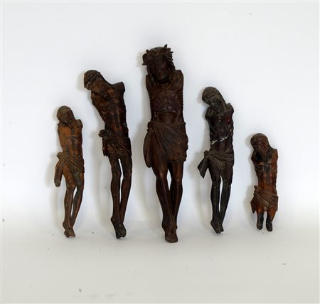 Lotto composto da cinque sculture in legno raffiguranti Cristo Crocifisso di diversa fattura ed epoca (difetti e mancanze)