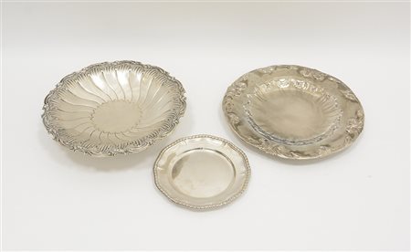 Lotto composto da un'alzatina, un vassoio e un piattino in argento con decori e misure diverse (gr 700 ca.) (lievi difetti)