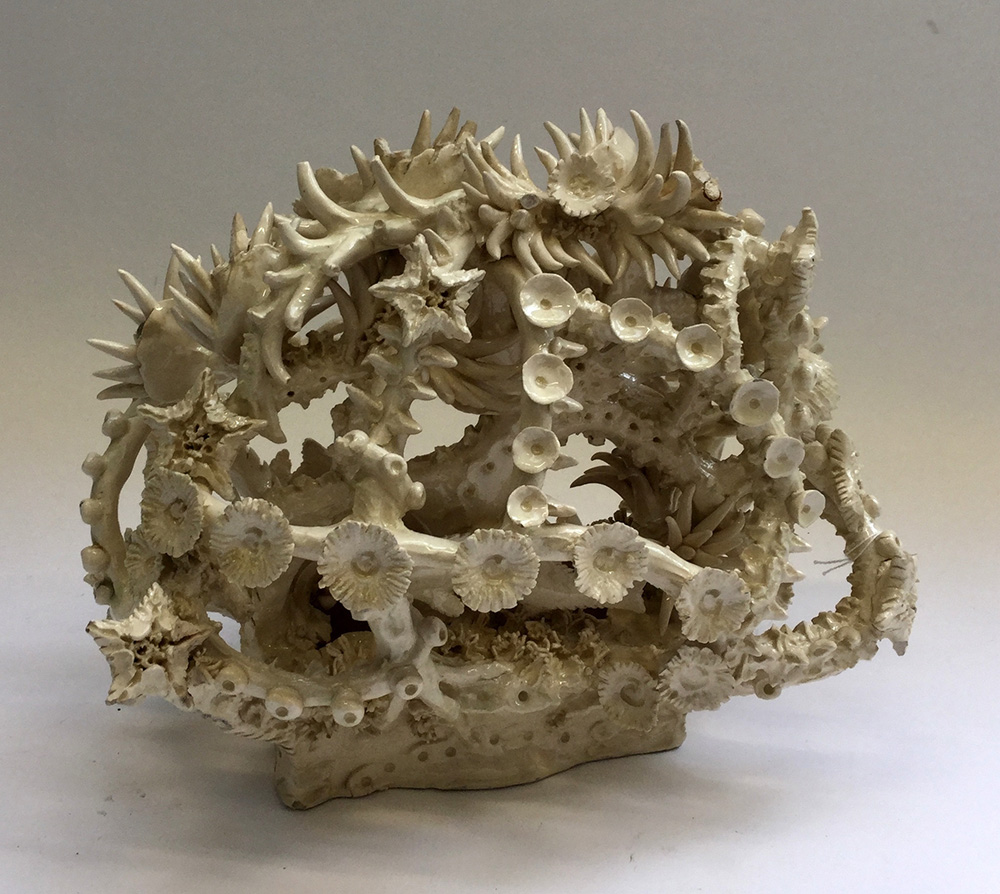Centrotavola in ceramica bianca raffigurante un fondo marino con pesce, corallo e stelle marine (cm 37x26) (difetti e mancanze)