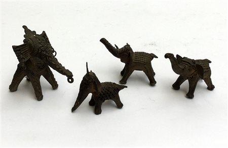 Manifattura orientale, "Elefanti" quattro sculturine in metallo dorato, misure differenti (difetti)